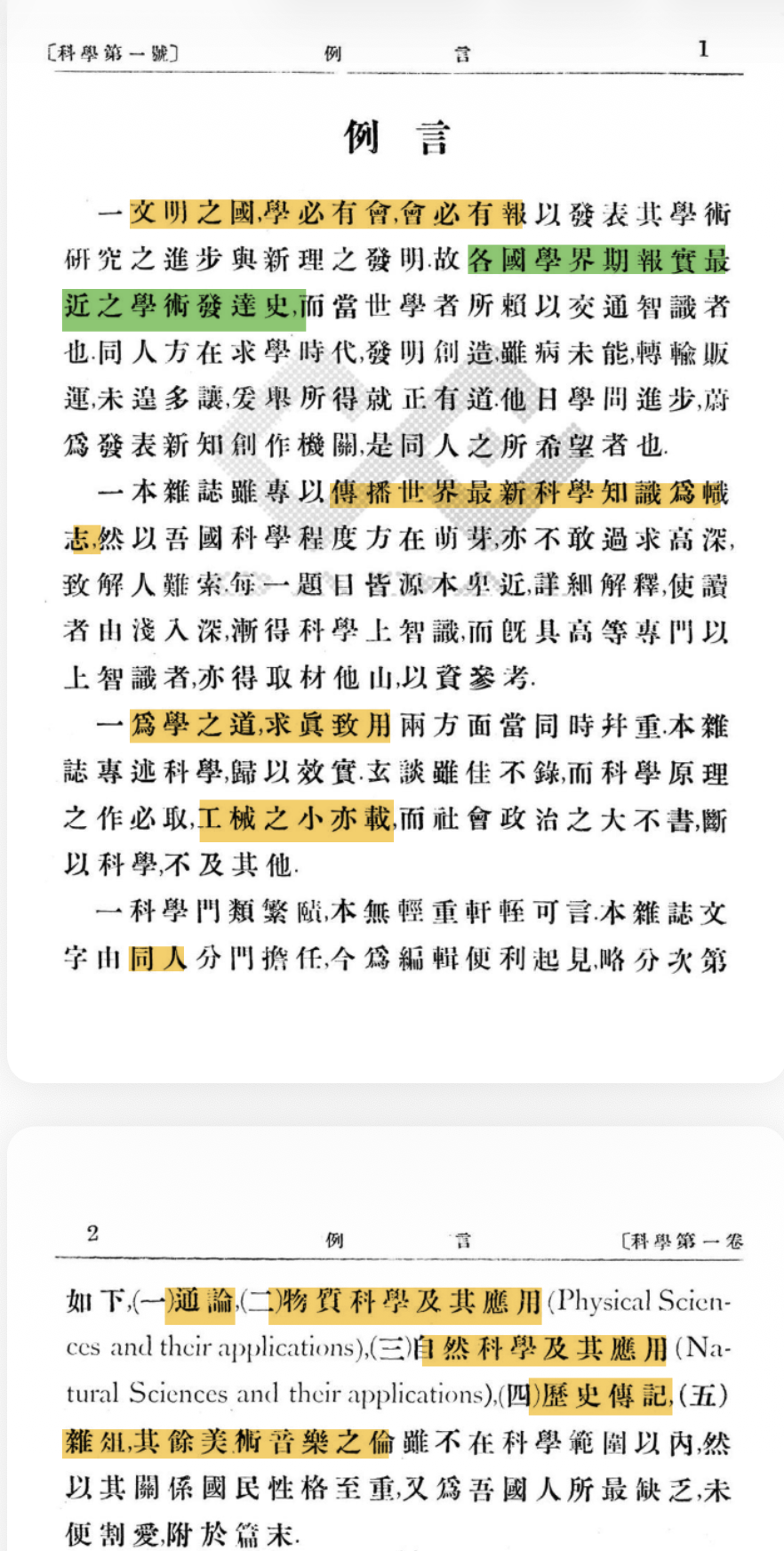 在微博博友@沉默是金快乐是福 的帮助下,找到了 1915年出版的《科学》杂志的创刊号,其中的例言和发刊词中,分别提到这样两段文字: