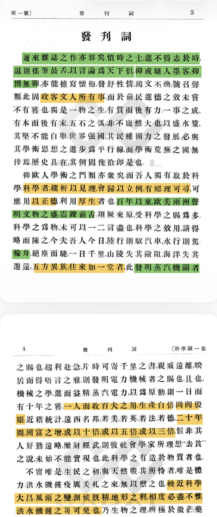 - 发刊词中还提到,「机械之学,进而益精,蒸汽电力以为原动,则一日而有十年之获,一人而收百夫之用,近稽统计,远西名邦,若美若英若法若德,二十年间,国富之增,或以十倍、或以五倍、或以三倍」。但是按我们对西方经济历史的了解,西方在 1915年之前,其实从未有过如此快速的发展,不然也不会惊讶战后日本的重建速度,以及进入二十一世纪后,近20年来中国的发展速度了