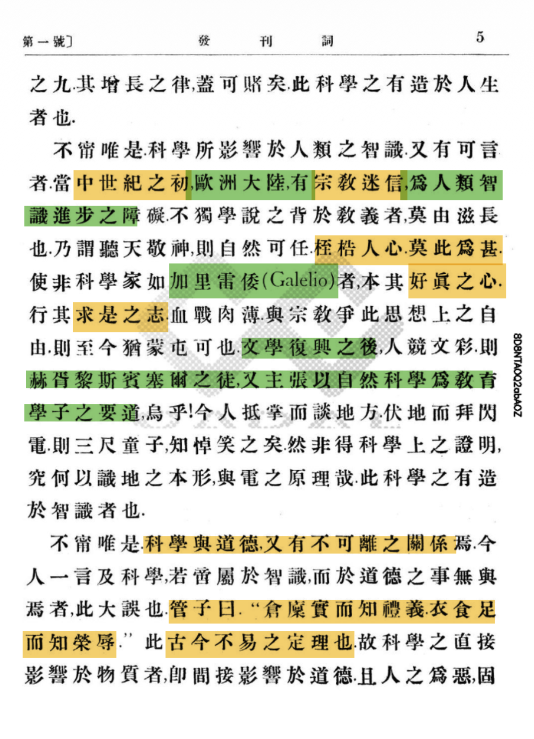 - 发刊词中提到,伽利略是非科学家。「使非科学家,如加里雷倭 Galelio 者,本其好真之心,行其求是之志,血战肉薄,与宗教争此思想之自由」。而且伽利略并没有与宗教血战肉搏,只是被囚禁过,但这段描述倒是非常像是唐末时期的黄巢、朱温的事迹了。
