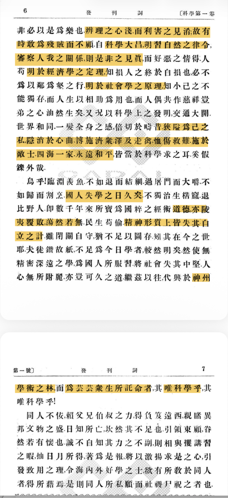 - 发刊词中提到了科学与道德的关系,从中可以看出,古人理解的道德,实际上就是合乎天道的自我意识,启发民智,树立博大的情怀,并非简单的个人品德和狭隘的儒教礼法。「科学与道德,又有不可离之关系…. 人之为恶,固非必以是为乐也。辨理之心浅,而利害之见淆,有时敢为残贼而不顾。自科学之大昌,明习自然之律令,则是非之见真,而好恶之情得,人苟明於经济学之定理,知损人之於自损也,必不为以邻为壑之行;明於社会学之原理,知小已之不能犹存,而人生以相助为用也,而人偶共作慈祥,岂弟之心油然生矣。又况以科学上之发明,交通大开,世界和同,一发全身之感,倍切於畴。昔狭隘为已之私隐消於心曲,博施济众泽及走禽,恤伤救难,施於敌士,四海一家,永远和平,皆当於科学求之耳」